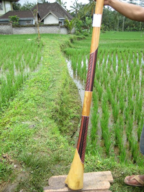 Didgeridoo aus Eukalyptus mit gefütterter exclusiver Tasche und Mundstück. Seht euch dazu den Video mit Ton an unter Produktdetails. Didgeridoo aus Eukalyptus. Holz: Yellowbox. Ton: D/ G. Länge: 149 cm. Mundstück: 3,1 cm. Bellend: 10 cm.