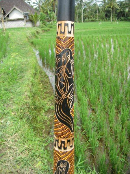 Sehr schön geschnitzt und bemaltes Teakholzdidgeridoo. Ca. 130 cm lang, wird mit Tasche und Mundstück verschickt. Hört euch den Klang auf Produktdetails an - Ihr bekommt genau so eines. Unterscheidet sich vom Klang von den Billig-Teakangeboten sehr positiv.
